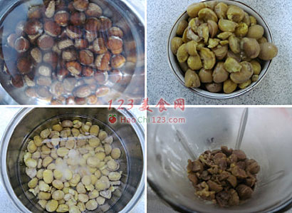 3、煮好后的栗子晾凉冷却,在放到搅拌机内,加入煮栗子泥的剩水,搅拌机能顺利搅拌即可。