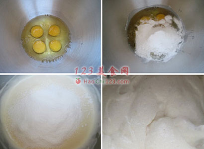 2、把鸡蛋放入无水无油的盆内再加上糖和盐用打蛋器打至颜色变乳白体积比原来的蛋糖大3倍左右用打蛋器可以写出字就算好了,这时可以倒入筛好的低粉,轻轻的拌匀。