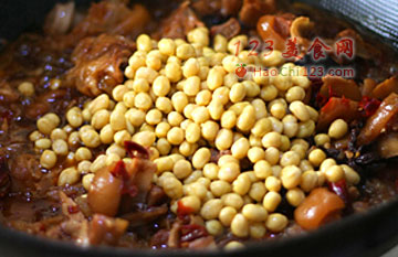 6、煮至水份充分被黄豆吸收,加入适量鸡精,炒匀,就可以起锅装盘了,最后撒上葱花,真是香啊!
