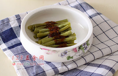 4、将熟豇豆蘸蒜汁儿,或将蒜汁儿浇在豇豆上拌匀食用。