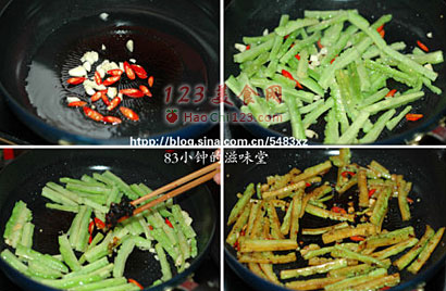 5、加入苦瓜煸炒2.3分钟,放入老干妈豆豉酱,白糖,香醋,少许盐略炒后即可起锅。