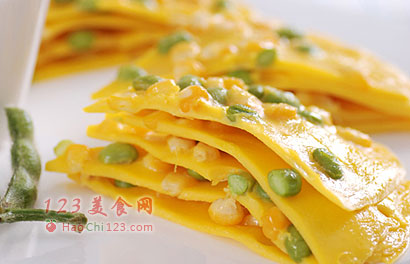 3、锅里加少许油,倒入蛋液一面凝固后翻面继续煎至凝固即可。卷起或切块食用。