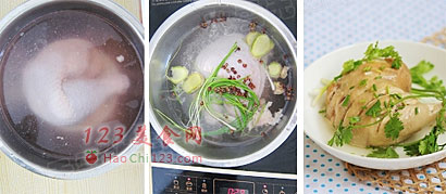 2、然后重新倒入清水,姜片,5克葱,料酒和花椒,加入鸡,水要没过鸡,中火煮8分钟再闷10分钟左右。