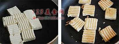 1)、火不宜大。始终保持中火,这样既能使豆腐表层迅速焦脆,又能封住豆腐中的水分保持内部的嫩滑。用小火当然也可以煎出焦黄的效果,但那样的豆腐里面就太老了。