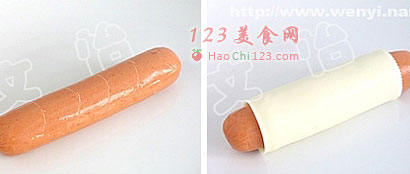2、将脆肠的表面斜切几刀,用乳酪片将脆肠卷起,再裹上一片培根。