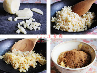 4、炒好的苹果粒加入红糖和肉桂粉。