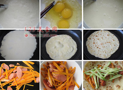 7、鸡蛋饼上刷少许面酱(辣酱也可),然后加入炒熟的胡萝卜丝、火腿肠和切成丝的黄瓜、大葱卷起即可。