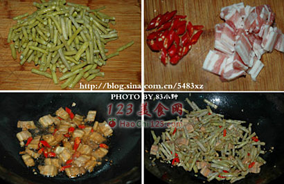 3、处理好的豆角切段。小米椒切丁,五花肉切片。