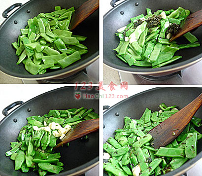 2、炒锅放入食用油,油热后下扁豆,中火翻炒至鲜绿且均匀受热,顺序加入雪菜末和蒜片,继续翻炒。