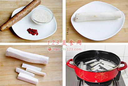 2、锅中放水,水开后倒入切好的山药,水开后捞出备用。