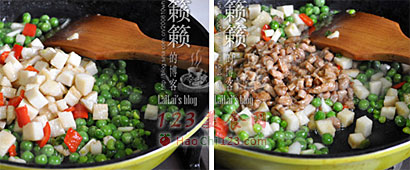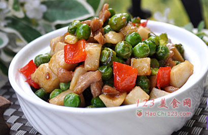 2、杏鲍菇洗净后擦干水,切丁备用;红甜椒去蒂去籽切丁备用;独蒜去皮切丁备用;青蒜洗净将蒜白与蒜叶分开,分别切段备用;将豌豆在沸盐水中氽煮至断生后捞出过道凉水备用。