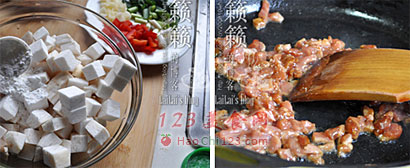 2、锅内留底油,热锅温油将腌制好的牛肉粒倒入,转动炒锅快速滑散,肉粒稍稍变色立即捞出控油备用。