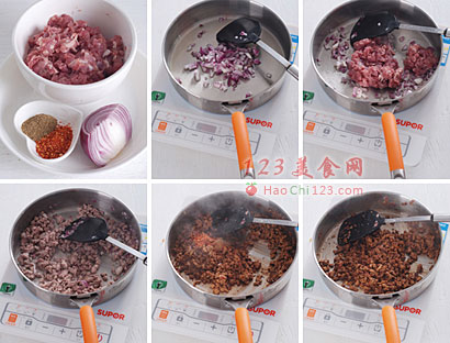 4、入电饼铛(不放油)烙至两面都起泡。四张都烙好备用。炒好的羊肉加入切碎的香葱拌匀备用。