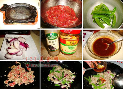 6、热锅凉油下肉片滑炒至变色,放洋葱、荷兰豆翻炒,淋上碗汁,翻炒均匀,出锅倒在铁板上。