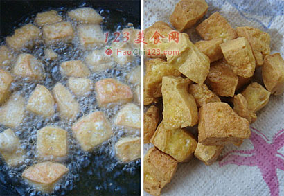 2、这道菜是第二天做的,豆泡炸好临时决定出去吃就直接用厨纸盖好,吸了一夜的油。
