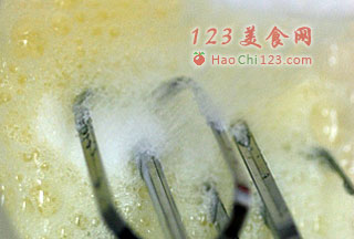 5、当蛋白泡沫比较细腻时,再加入1/3砂糖,继续高速搅拌,直至蛋白基本打发成蓬松泡沫,加入剩下的糖,继续打发至湿性发泡,也就是用打蛋器头挑起一些蛋白糊,呈现可以轻轻弯下的状态即可。