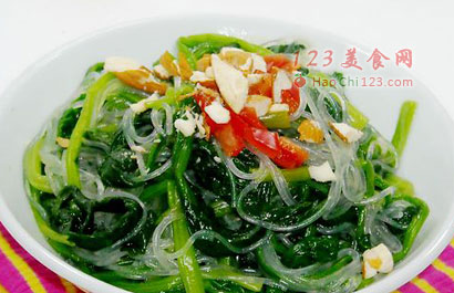 4、把烫熟的粉丝和菠菜捞起,沥干水分,装进大碗里,淋入麻油、加入蚝油,用筷子拌匀,撒上红椒粒和杏仁碎装饰即可。