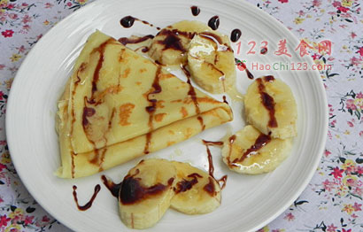 4、因为加了黄油,表面会有一些花纹,可丽饼折起来,香蕉切片。