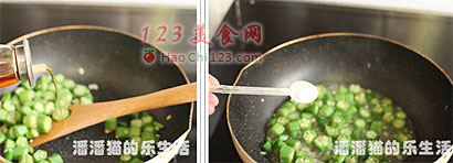 6、倒入适量的清水焖两分钟,秋葵在烹炒的时候会分泌初黏稠的液体,这样都省的用水淀粉勾芡了,临出锅的时候放入适量的盐就好了。