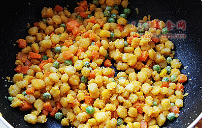 5、锅里留底油,将豌豆和胡萝卜下锅,炒熟后盛出,锅里放一勺油,将咸蛋黄末放入锅中小火煸炒,等到蛋黄开始冒泡沫时,将玉米粒下锅煸炒,使每粒玉米都均匀裹上咸蛋黄。