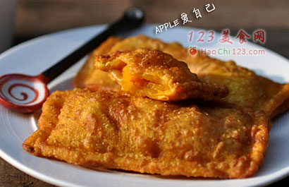 3、炸的时候注意别炸糊了哈,哈哈,不用炸太久的,馅儿本身就是熟的,只要馅饼皮尔脆了就OK袅。