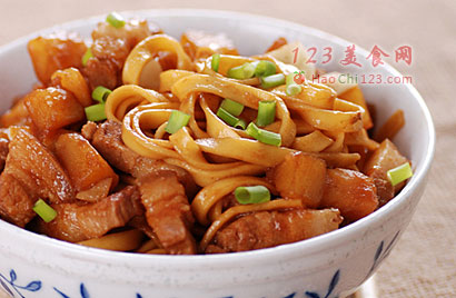 4、这时加入煮至8成熟的面,继续翻炒均匀,根据自己的口味调入适量盐。加入切碎的大蒜稍微一拌即可出锅。