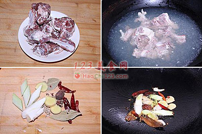 2、炒锅中倒入适量油,倒入所有香料小火煸炒出香味后,倒入羊蝎子翻炒2分钟出香味。