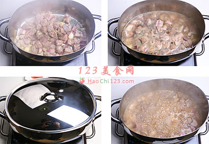 6、浇入牛肉高汤,先煮开,再调至小火。
