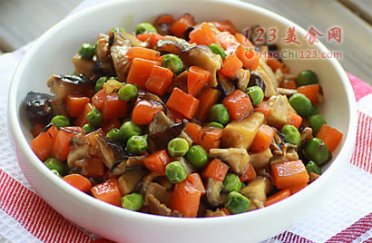 4、再放入胡萝、豌豆丁翻炒2分钟,入生抽和蚝油、糖翻炒。