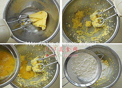 3、黄油加入砂糖用搅拌器搅拌均匀,分次加入鸡蛋,继续用搅拌器以快速方式拌匀,同时将低筋粉、泡打粉、奶粉过筛加入。