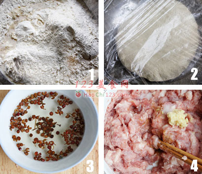 4、将猪肉剁馅,分几次放入花椒水,向一个方向搅打。再放入盐、姜末、料酒、花椒粉、酱油,向一个方向搅拌均匀。