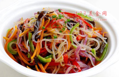 4、另起锅,入少许油,油烧热后放入五彩丝翻炒。