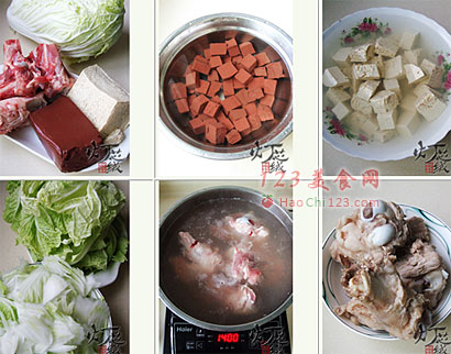 7、炒至白菜变软,添加适量的骨头和汤,添加豆腐和猪血,大火煮开。
