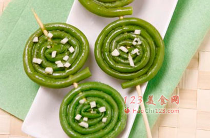 2、把豆角从头卷成圈,用竹签把豆角串起来。