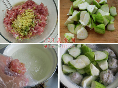 3、将手上涂一点油,将肉馅放入手掌心,握成拳,让肉馅从大拇指和食指形成的环圈中挤出,形成丸子,然后放入水中。