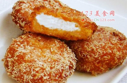 2、用拌好的南瓜泥裹住酸奶块制成丸子,粘上面包糠,放油锅中炸至表面金黄出锅摆盘。
