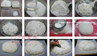 2、这种面团水份含量大,很湿,整形的时候需要加些干粉,案板上,手上都要有粉,否则会有一大块湿粘的面团就粘在你的手上。所谓的整型也简单,就是把面团重新拉伸几下,用面刀和手交替合作,把面团拢一拢,拢成个圆形,收口向下,表面呈光滑状即可。喜欢其他造形的可以再做其他,切件、割口等等都可以。
