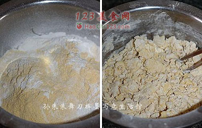 2、放入酵母粉和食用碱(可以省略)边倒温水边用筷子搅成小面疙瘩,水倒入2/3就可以,因为不同牌子的面粉的吸水性也不同,剩下的水可以根据实际情况再添加。