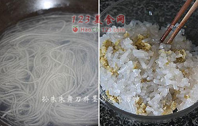 7、将粉条放入热水中小火煮到里面没有白色的硬心,然后捞出过凉水。