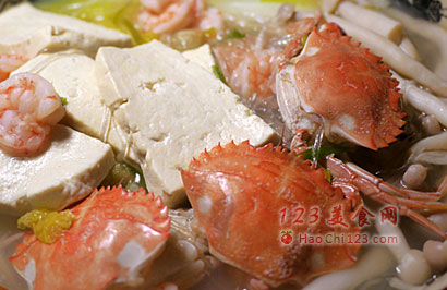 2、放入切好的豆腐块,加入蟹盖,继续煮上5分钟,之后加入白菜叶和泡过的粉丝,大约2分钟后,撒上适量的盐,加入适量的白胡椒粉,滴上几滴香油,即可食用了。
