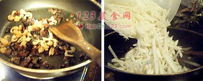 2、加入萝卜丝炒均匀后,调入盐,鸡粉,胡椒粉煮10分钟。