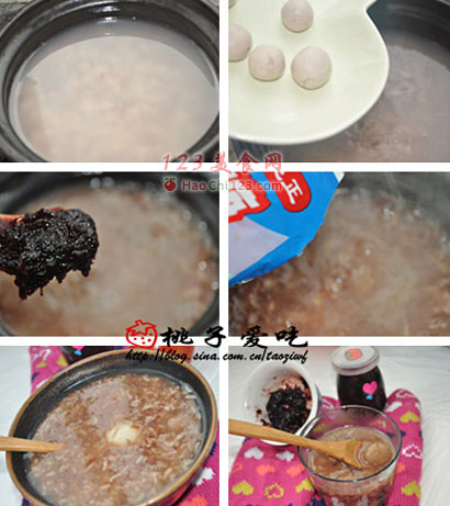 6、粥好了时候,把元子都放入红米粥中,煮熟!我手太勤快了,在粥里加了一勺洛神花果酱,结果有点果酱微酸的赶脚啦!