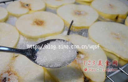 4、将烤盘放入预热好的烤箱,烤制15分钟后,将烤盘取出,将梨片全部翻面,再重复上一个步骤将梨片上撒好白砂糖,将烤盘放回烤箱,再烤制15分钟。然后再放到烤架上继续烤到边缘稍微翘起,水分完全干即可。