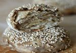 13、将刷了蜂蜜水的一面在白芝麻里压一下,使面团表面沾满白芝麻。