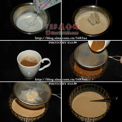 2、牛奶煮过后会有奶皮,步骤5过筛的步骤切不可少。多次过筛会让奶茶口感更顺滑。
