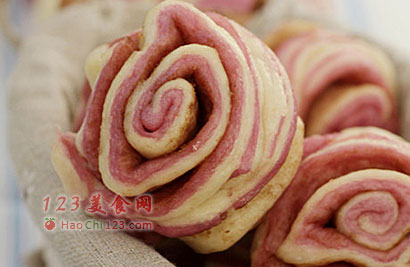 3、后反复揉搓,取一半用面条机分别压成紫色和白色的的面团,叠加在一起,卷起,然后切成三厘米左右的段即成紫薯馒头。
