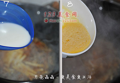 5、淋蛋液的时候,不要一下子倒入,把蛋液形成细流状淋入,从外望里慢慢转圈淋入,用汤勺推开即可。