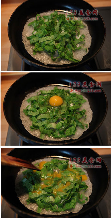 3、待特大与蕃薯糊七八熟后加入青菜段略煎几十秒,在表面打入一个鸡蛋用铲子均匀铺在青菜上。