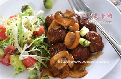5、调成小火,放入黄油,待融化后,放入切成片的口蘑炒软后,调入酱油和淡奶油(没有的话可用少许牛奶代替),继续用小火熬成浓稠的酱汁后,淋在肉丸上即可。