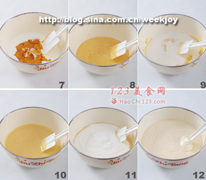 3、酸奶加芒果酱拌匀,倒入放凉的吉利丁牛奶液拌匀(图7,8,9,10)。